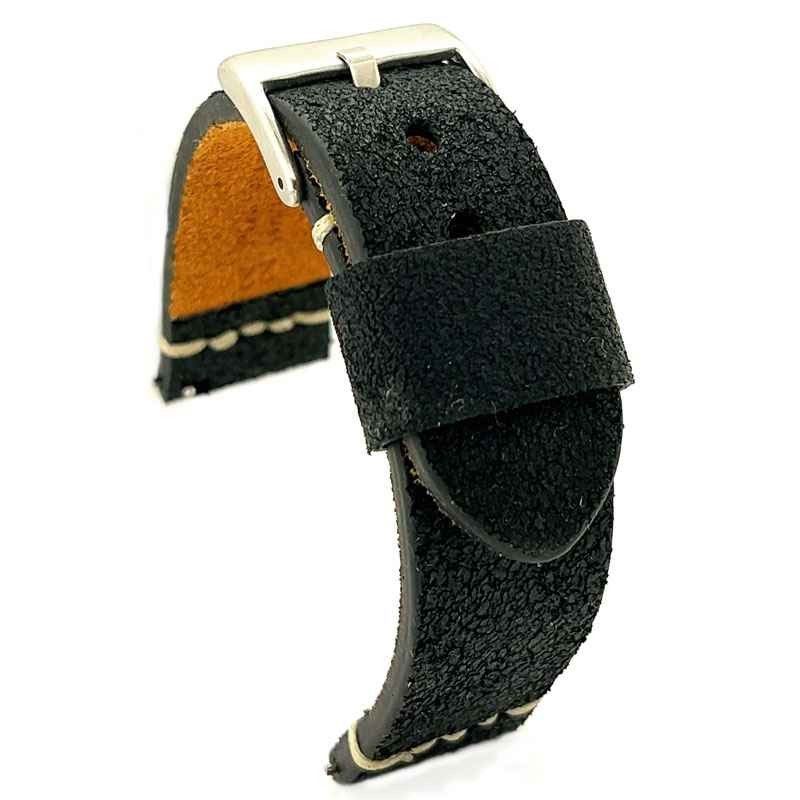 Para la fabricación de este modelo de correa de piel para reloj empleamos piel de ternera curtida en Italia con un tratamiento que simula el paso del tiempo y añade al cuero un efecto superficial de cuarteado.